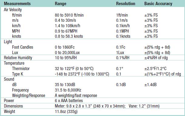 ·大LCD液晶顯示屏,可同時(shí)顯示溫度和風(fēng)速,相對(duì)濕度 ·數(shù)據(jù)保持和最小/最大功能 ·內(nèi)置低摩擦葉輪提高空氣流速的準(zhǔn)確性,精密薄膜電容濕度傳感器響應(yīng)速度快,熱敏電阻可準(zhǔn)確測(cè)量環(huán)境溫度 ·K型熱電偶通道可測(cè)量溫度高達(dá)1300℃ ·采用精密光電二極管和余弦和色彩校正器校正光測(cè)量 ·聲級(jí)測(cè)量符合IEC 61672標(biāo)準(zhǔn)2類使用頻率加權(quán)和快速響應(yīng)時(shí)間 ·低電池及超量程指示 ·重量:181g