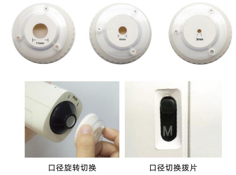 (6)提供三口徑切換(11mm,6mm,3mm) 旋轉即可切換口徑,告別了繁瑣的手動擰螺絲固定口徑方式。 大口徑(Φ11mm)撥到“M”檔。 小口徑(Φ6mm、Φ3mm)撥到“S”檔。