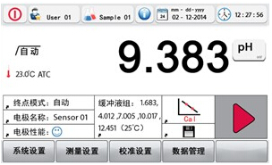 所有pH測量和校準(zhǔn)相關(guān)的重要信息都清晰地顯示在4.3寸的彩色大液晶屏上。一次簡單觸摸即可進(jìn)行測量、校準(zhǔn),或者在不同測量模式切換,隨機(jī)可見,如:電極狀態(tài)、當(dāng)前緩沖液組等。可簡單一次觸摸,即進(jìn)入對應(yīng)的樣品名,用戶名,時間日期等的設(shè)置。